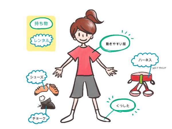 チョーク(滑り止め)も200円前後でレンタルできます。服装は、とにかく動きやすい服装にしてください。ただし、室内ジムで運動をするので、動きやすいジャージ、Tシャツ、ハーフパンツなどでOKです。